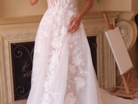 This A-line wedding gown features a sweetheart neckline, thin straps, and a sheer boned bodice for enhanced support. The layered tulle skirt is adorned with scattered lace and dimensional floral appliques, creating a dreamy, romantic look. Perfect as a bridal gown, it offers an ethereal elegance for your special day.